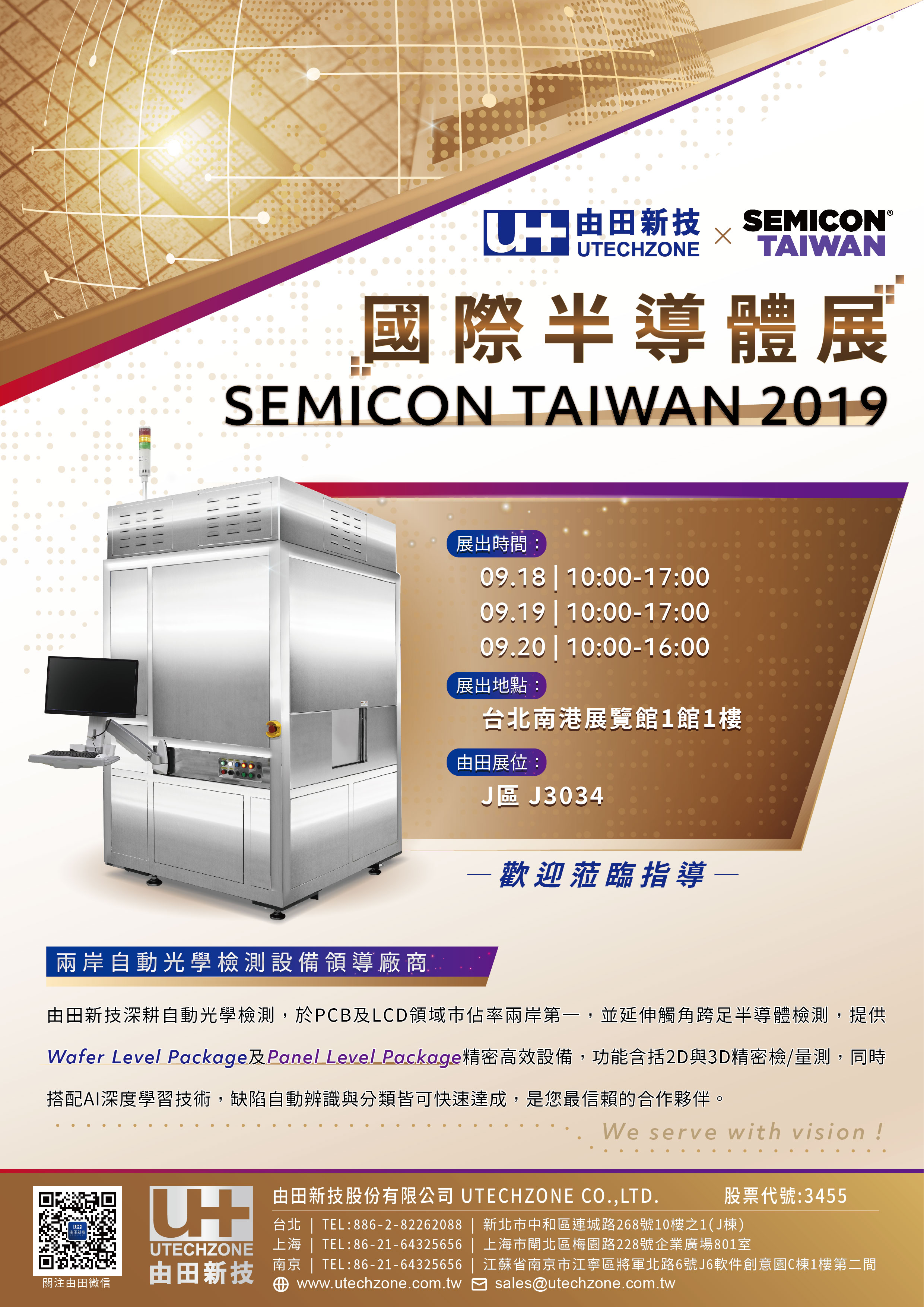 SEMICON Taiwan 2019 國際半導體展,由田攤位號 J3034,歡迎蒞臨參觀!