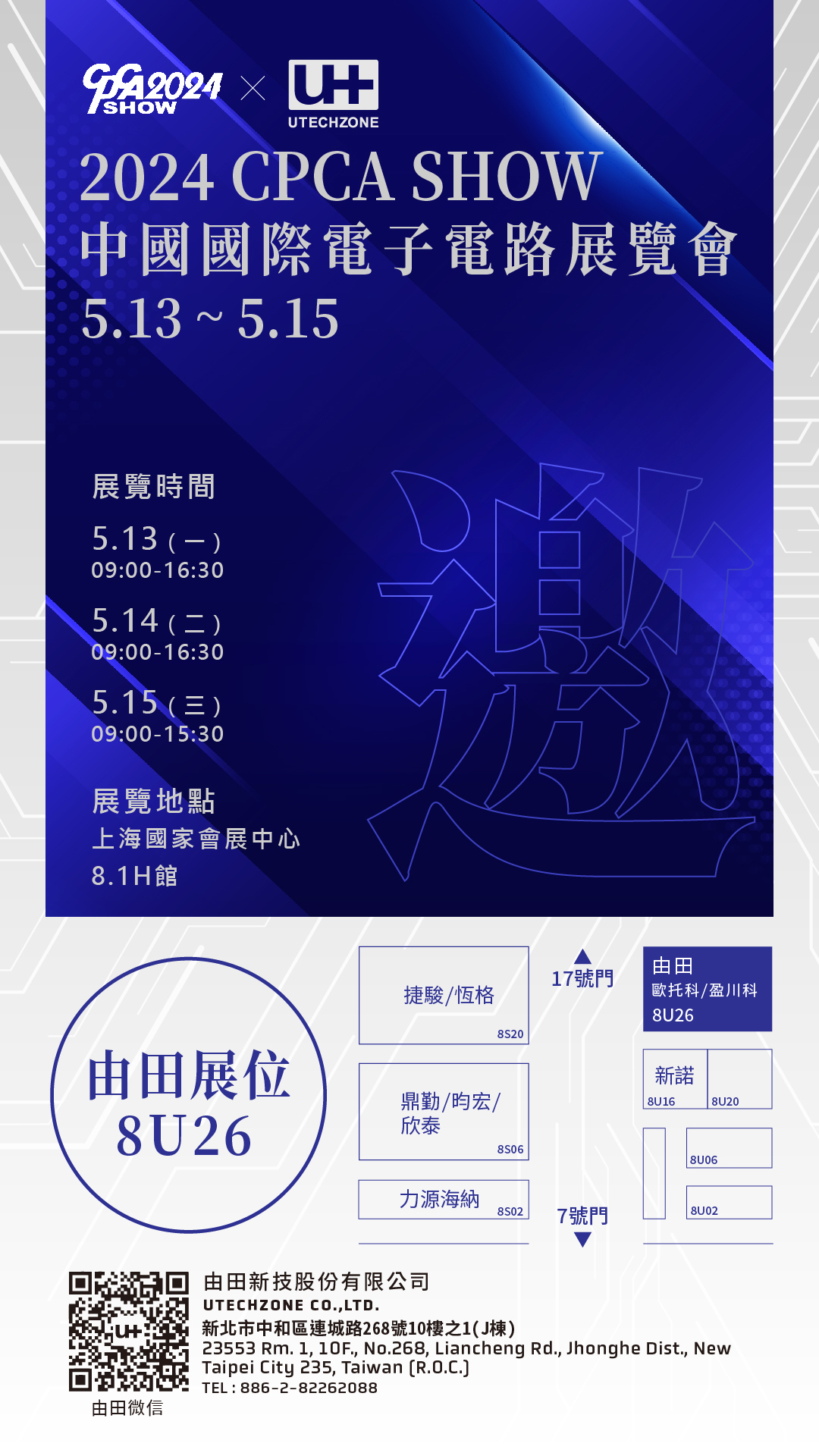 2024 CPCA SHOW 中國國際電子電路展覽會 (5/13~15),由田攤位號 8U26,歡迎蒞臨參觀!