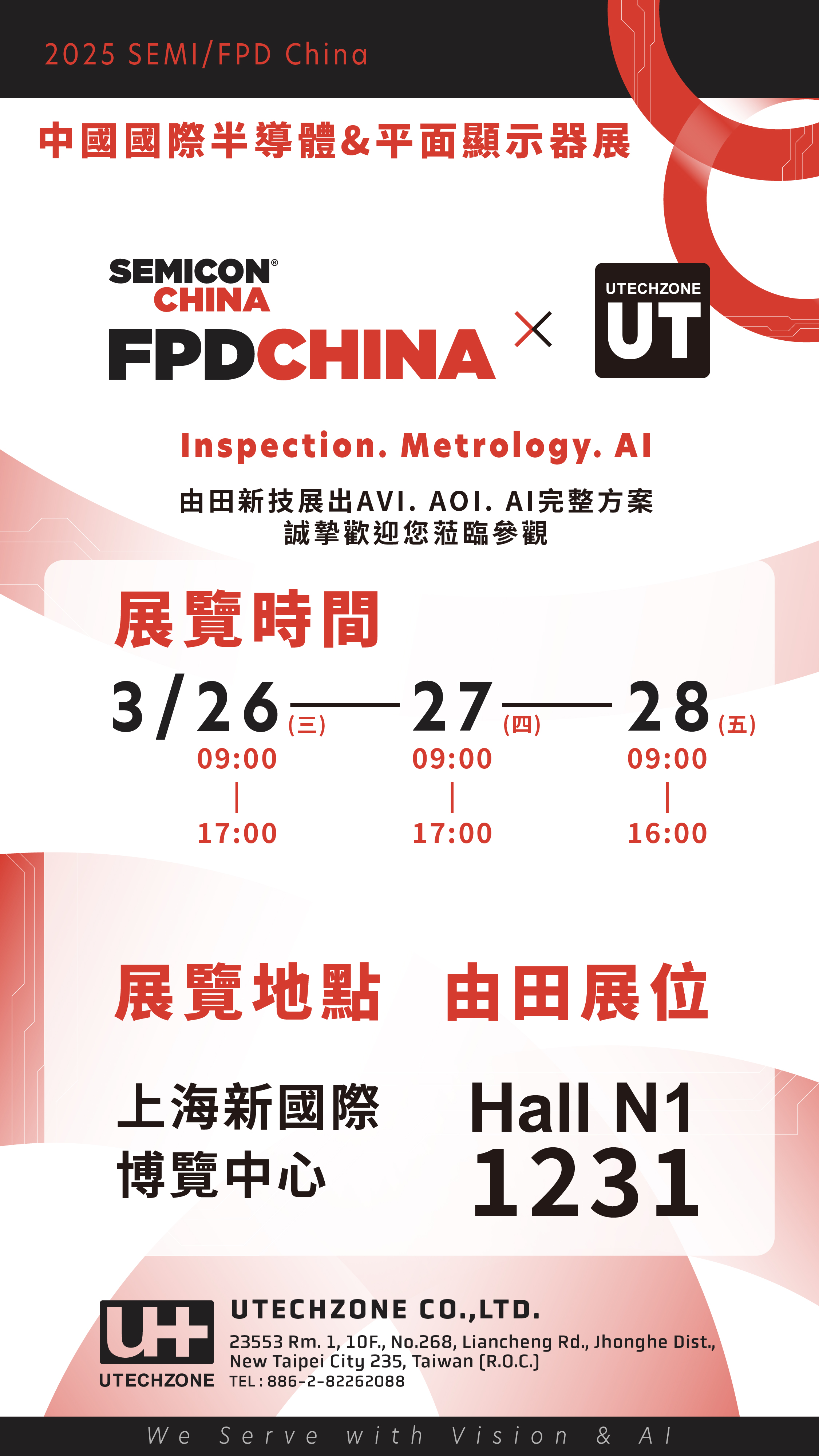 2025 SEMI/FPD China 中國國際平面顯示器展 (3/26~28),由田攤位號 N1 1231,歡迎蒞臨參觀!