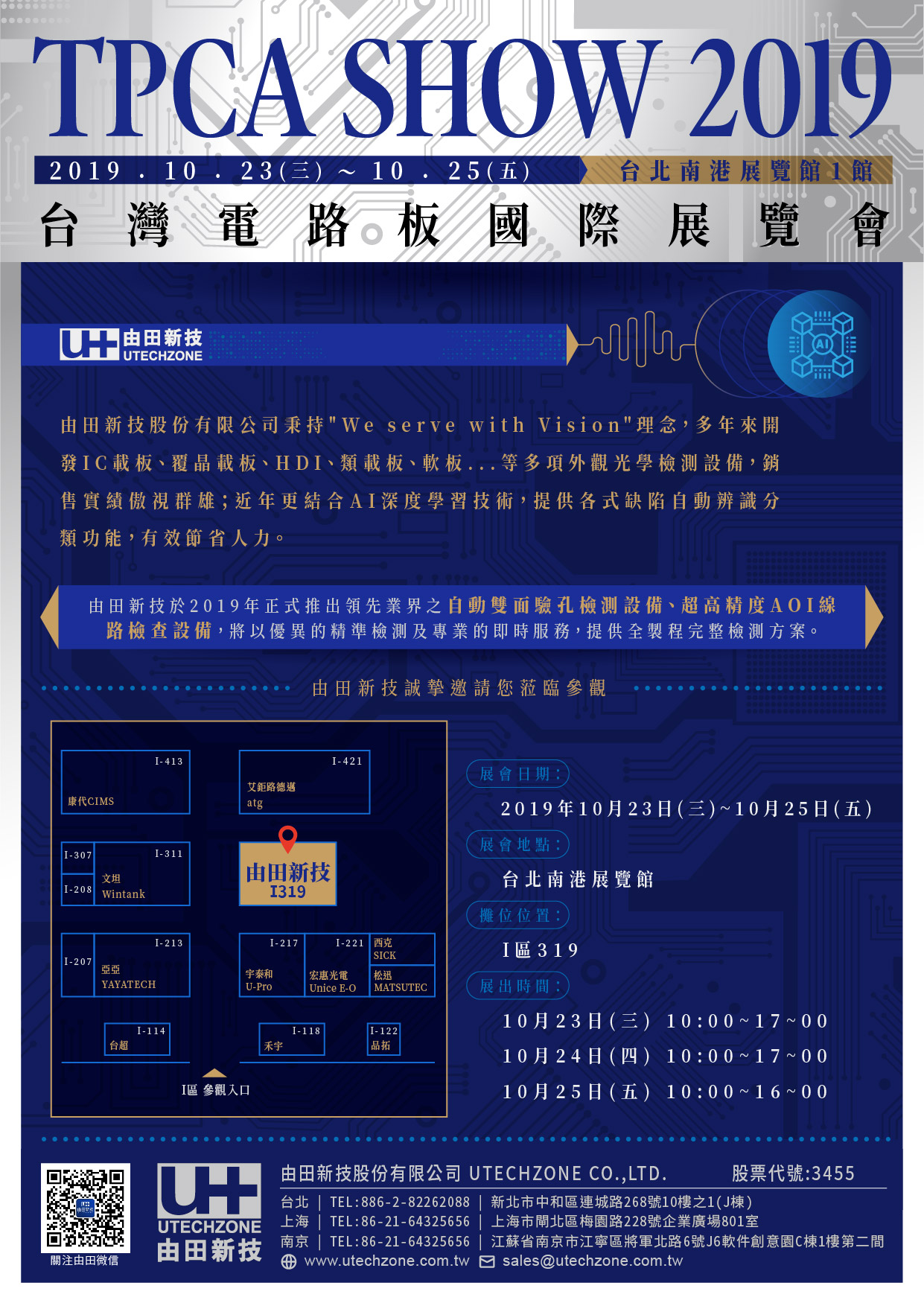 TPCA SHOW 2019 台灣電路板產業國際展覽會,由田攤位號 I319,歡迎蒞臨參觀!